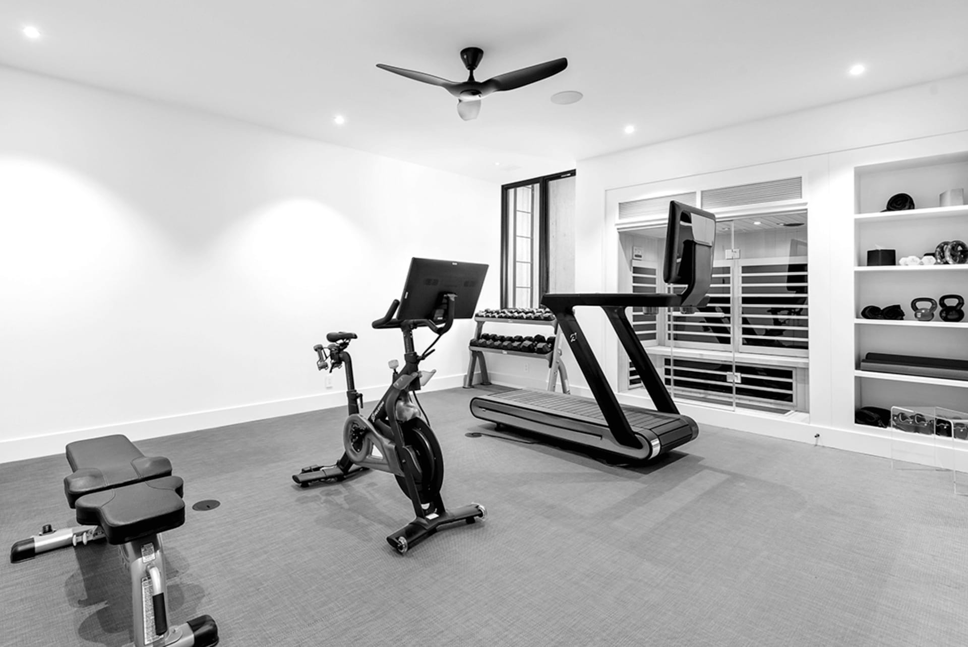 When it comes to equipment, prioritize versatility and functionality for a well-rounded sweat session. Adjustable dumbbells, resistance bands and a stability ball are all excellent choices for a variety of workouts. If space and budget allow, you might also consider investing in a cardio machine such as a treadmill, elliptical or Peloton equipment. Ensure your home gym is kept tidy and organized with shelving units or storage bins for smaller items like towels, water bottles and workout accessories. This not only keeps clutter hidden away but also makes it easier to find your home fitness essentials when it’s time to exercise.