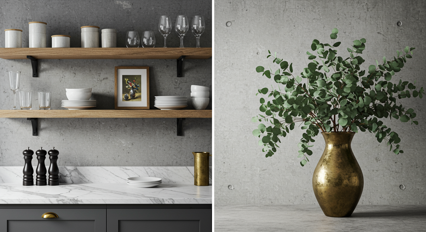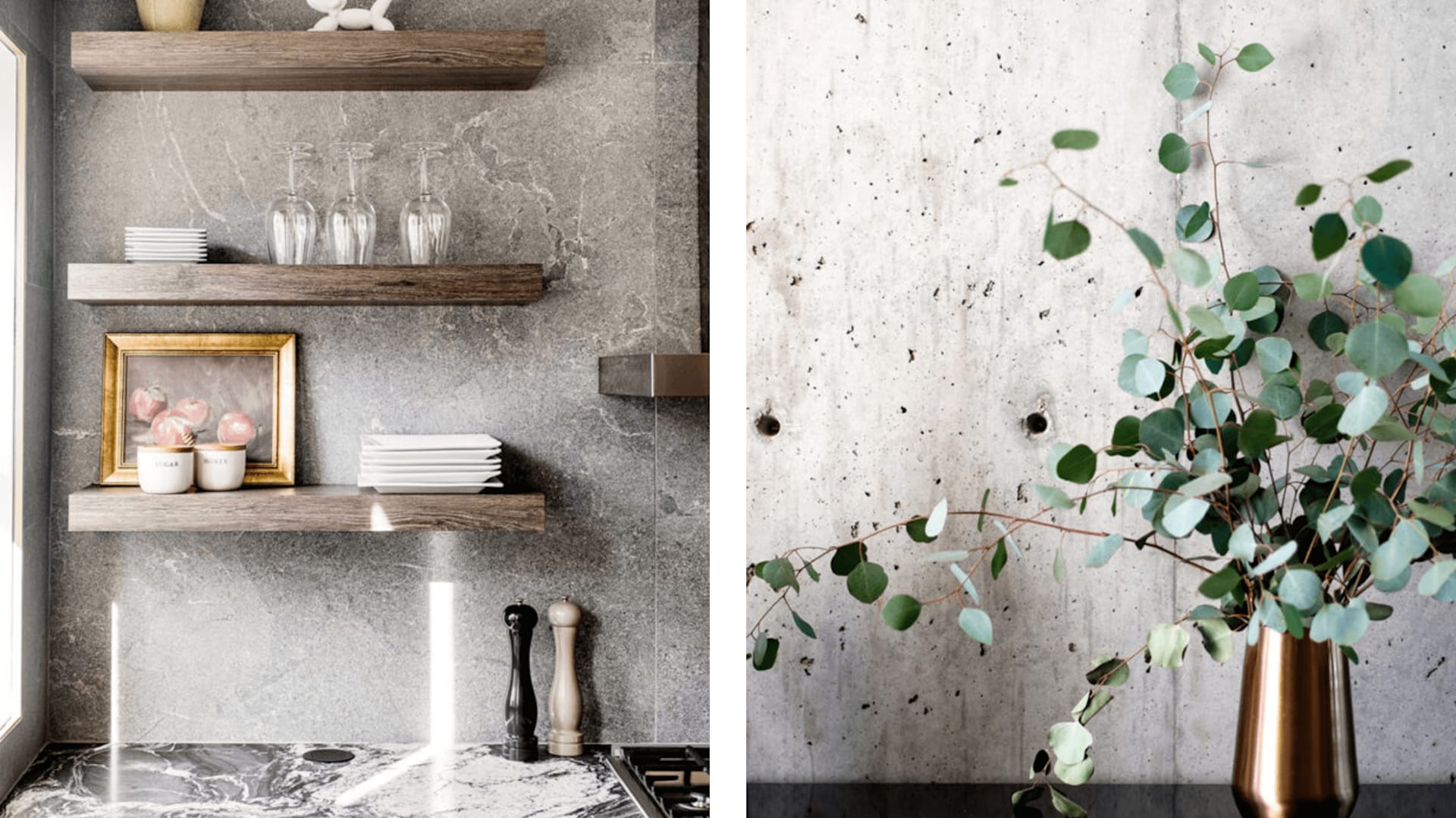 Wood can be represented by plants, cut flowers and earthy colors such as green and teal.