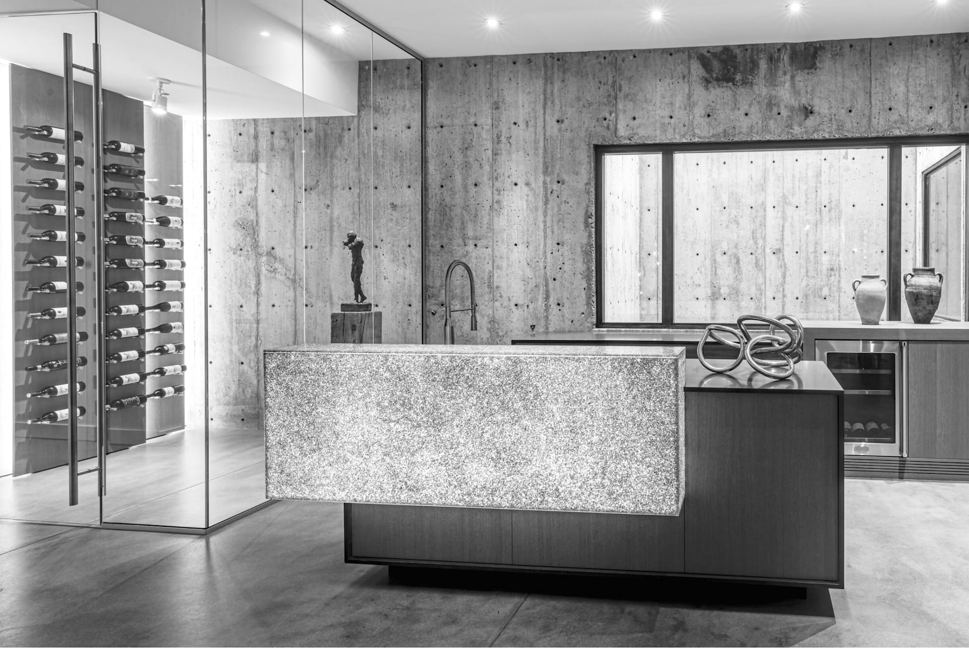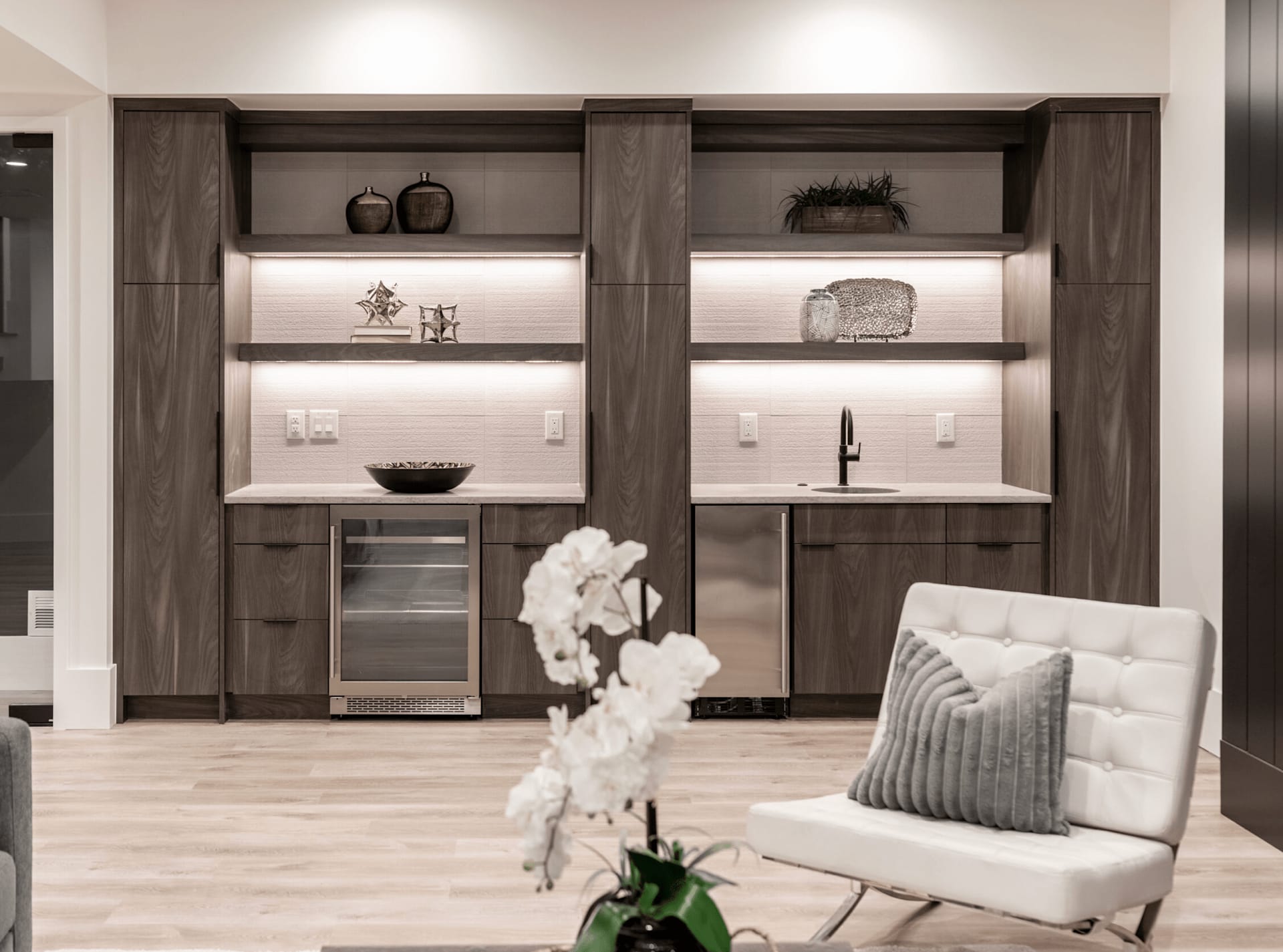 The first step in creating a beverage bar is determining the best placement based on your home’s needs and preferences. Whether it’s a cozy corner of your living area, a spacious lower beverage bar level, elegant home office or a sunny kitchen nook, the location is key to determining the design and functionality of the space. Consider factors such as the size of the area, the ambiance you want to inspire and your entertaining goals. If adding a prep sink to your home beverage bar, ensure the location is close to plumbing and electricity for convenience. For more compact spaces, a bar cart presents a portable option to travel from room to room.